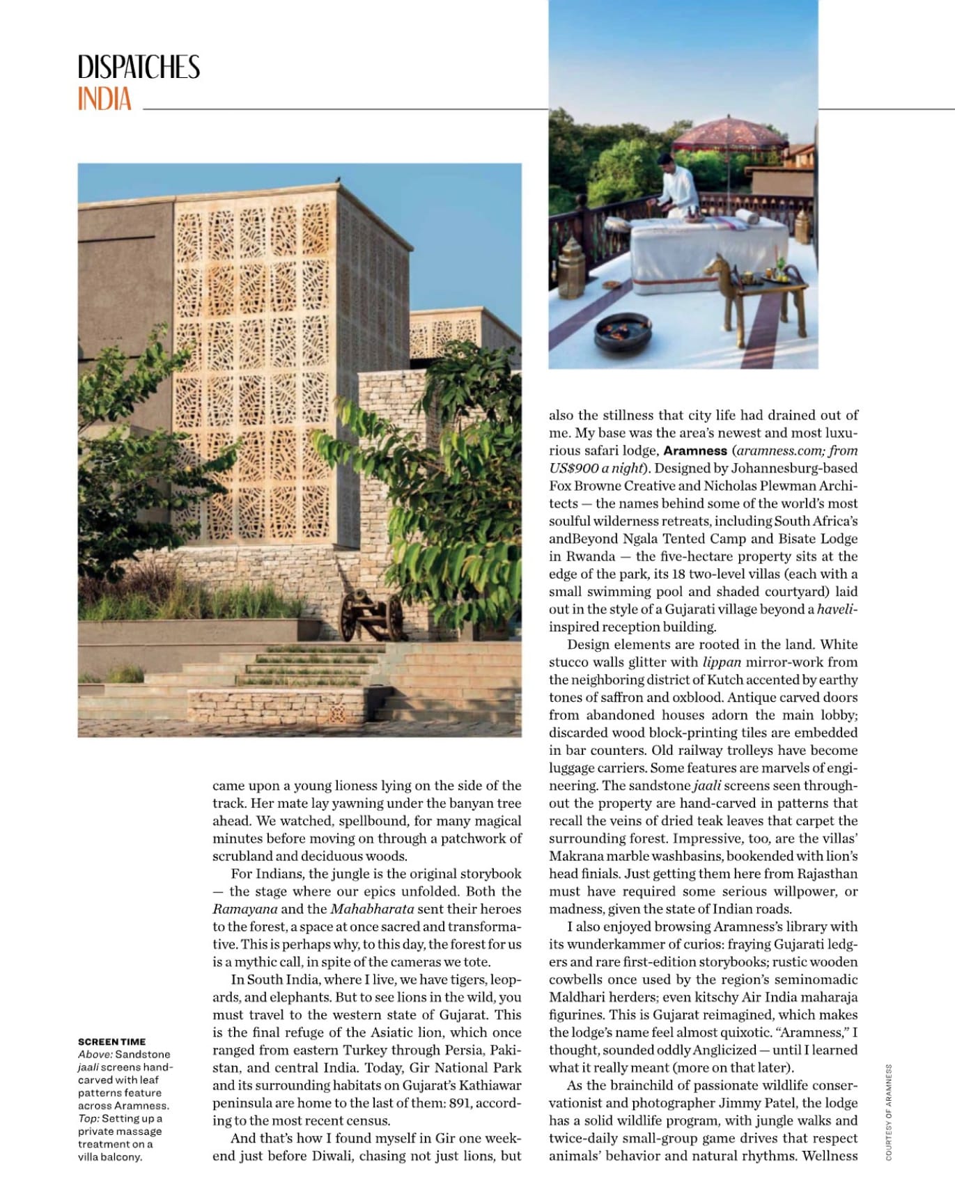 And that’s how I found myself in Gir one weekend just before Diwali, chasing not just lions, but also the stillness that city life had drained out of me. My base was the area’s newest and most luxurious safari lodge, Aramness. Designed by Johannesburg-based Fox Browne Creative and Nicholas Plewman Architects — the names behind some of the world’s most soulful wilderness retreats, including Rwanda’s Bisate Lodge and andBeyond Ngala Tented Camp in South Africa — the five-hectare property sits surrounded by teak forests and grasslands at the edge of the park, with just 18 two-story villas (each with a small swimming pool and shaded courtyard) laid out in the style of a Gujarati village beyond a haveli-inspired reception building.