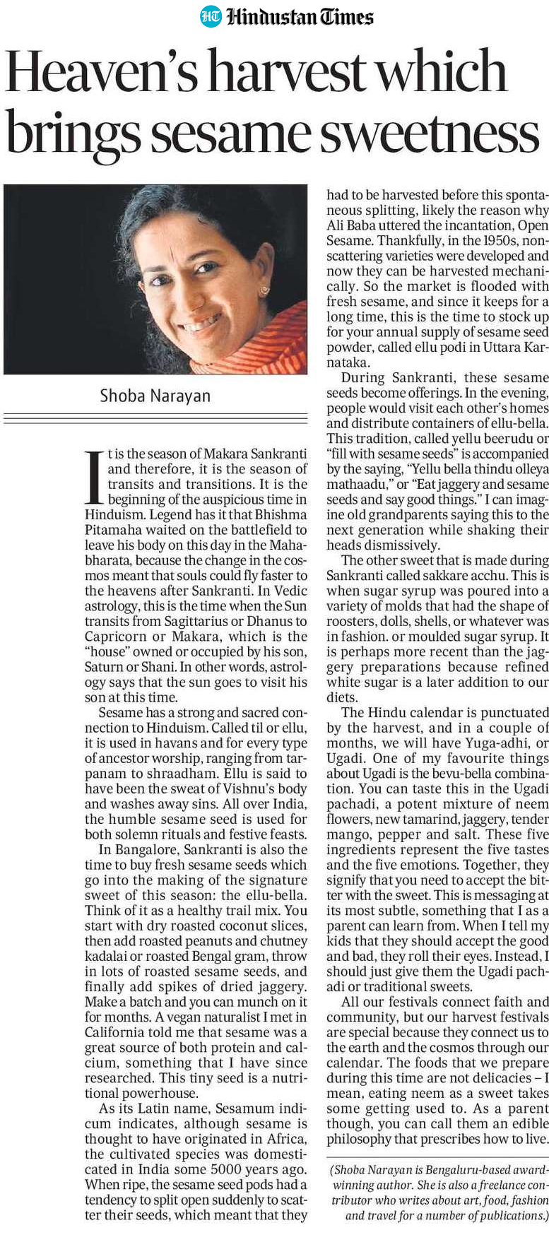During Sankranti, these sesame seeds become offerings. In the evening, people would visit each other’s homes and distribute containers of ellu-bella. This tradition, called yellu beerudu or “fill with sesame seeds” is accompanied by the saying, “Yellu bella thindu olleya mathaadu,” or “Eat jaggery and sesame seeds and say good things.” I can imagine old grandparents saying this to the next generation while shaking their heads dismissively.