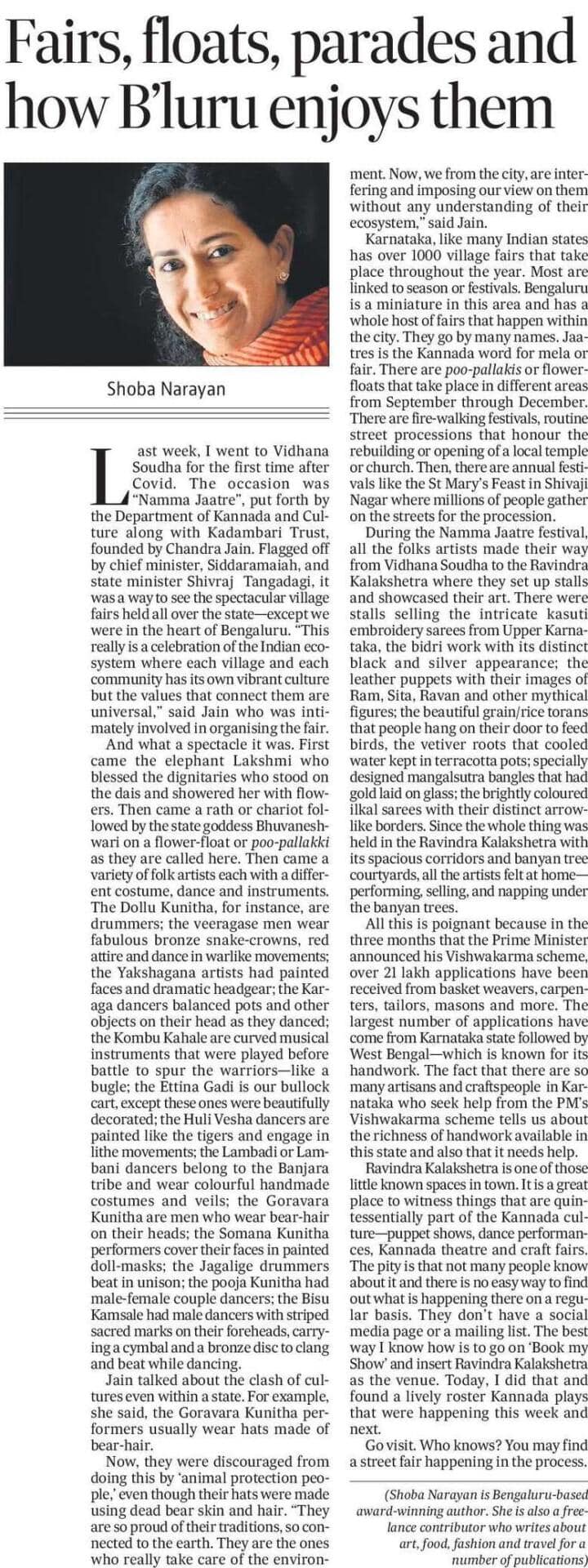Last week, I went to Vidhana Soudha for the first time after Covid. The occasion was “Namma Jaatre,” put forth by the Department of Kannada and Culture along with Kadambari Trust, founded by Chandra Jain. Flagged off by Chief Minister, Siddaramaiah, and Minister Shivraj Thangadagi, it was a way to see the spectacular village fairs held all over the state—except we were in the heart of Bangalore. “This really is a celebration of the Indian ecosystem where each village and each community has its own vibrant culture but the values that connect them are universal,” said Jain who was intimately involved in organising the fair.