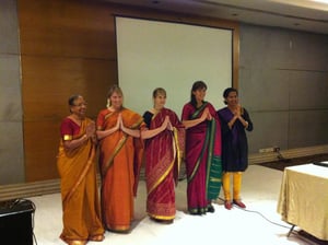 Professor Ravi Bapna’s class from the Carlson School of Management’s Executive MBA program visited India. I spent one morning– three hours from 9-12– doing a ‘cultural immersion’ class. We discussed history, customs, culture, music, dance (with a performance at the end), and had a great interactive session. They asked tough questions about all the things that stare us in the face: the filth, the beggars, the slums, the traffic. But what surprised me was that they seemed to intuitively ‘get’ the contradictions that make up this crazy country of ours. Why do people seem so content amidst such poverty– that type of thing. They sang ‘Vande Mataram’ in chorus, wore sarees and discussed cuisine. Here is a photo of the lovely ladies