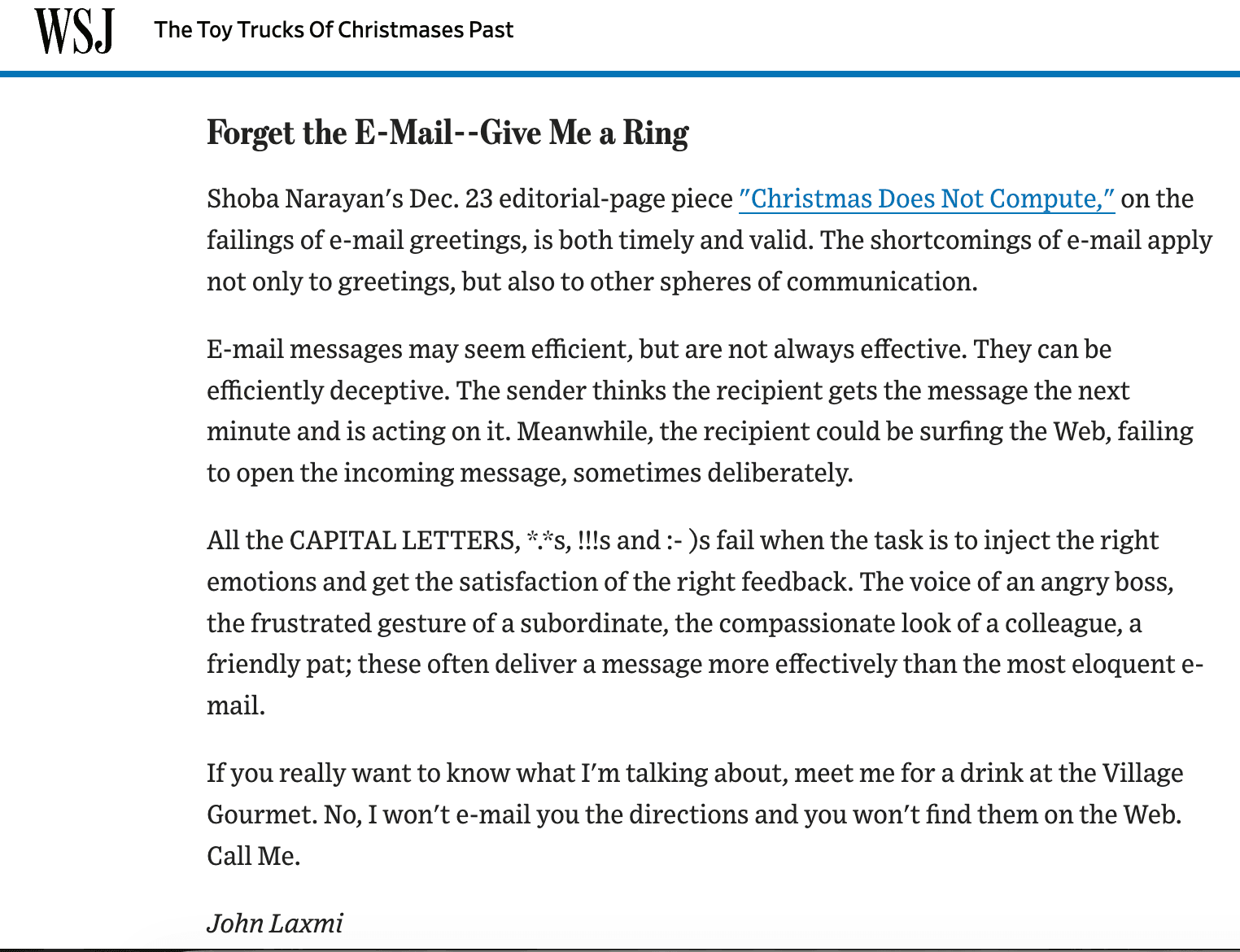 To all those who send electronic greeting cards this holiday season, I say. Use the computer for transferring banal accounting information through efficient Excel files. Send a terse email memo to your entire office, by all means. But if you want to send a message that captures the warmth and joie de vivre of this season, turn off your computer.