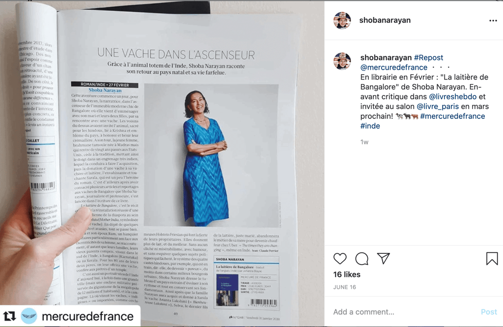 Cette aventure commence un jour, pour Shoba Narayan, la narratrice, dans l’ascenseur de l’immeuble moderne chic de Bangalore où elle vient d’emménager avec son mari et leurs deux filles, par sa rencontre avec une vache. Les voisins du dessus avaient invité l’animal, sacré pour les hindous, lié à Krishna et emblème du pays, à honorer et bénir leur crémaillère. A son tour, la jeune femme, brahmane t