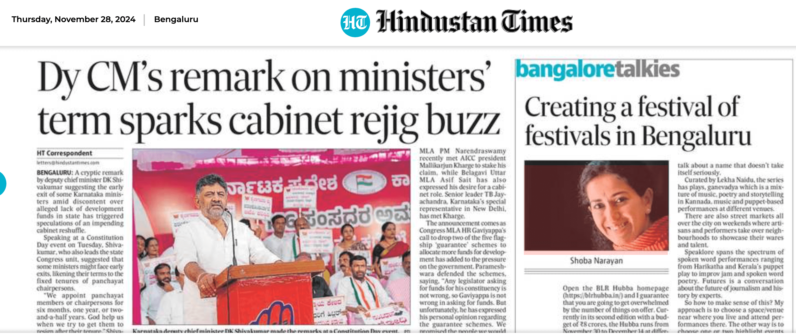 There are some verticals. Live music (named Kantha) happens in the evening at Freedom Park, with artistes including Pashabhai, M.D. Pallavi, the Bangalore Children’s Chorus and other performers from across India. Gode or Wall incorporates street art murals by a variety of artists across different metro stations of Bangalore. Chosen through an open call by a respected jury of art practitioners including Suresh Jayaram, Archana Hande and Ravikumar Kashi, GodeBLR is curated by Kamini Sawhney. The performing art series, titled Offbeat, has a number of collaborations. Guru-Shishya as evident by the name includes performances by respected teachers and their senior students including stalwarts such as Vinayak Torvi, M.S. Sheela, Poornima Kulkarni and many others. There are also performances in beautiful heritage city spaces such as Panchavati, the home of Sir. C.V. Raman in Malleshwaram and Sabha, a new theatre space on Kamaraj Road. A Maker’s Trail that highlights collaboration between architecture and design, curated by Manju Sara Rajan is a way to go behind-the-scenes. Kannada music, dance and theatre take centre stage in Gala Gala Gaddala – talk about a name that doesn’t take itself seriously. Curated by Lekha Naidu, the series has plays, ganevadya which is a mixture of music, poetry and storytelling in Kannada, music and puppet-based performances at different venues. There are also street markets all over the city on weekends where artisans and performers take over neighbourhoods to showcase their wares and talent. Speaklore spans the spectrum of spoken word performances ranging from Harikatha and Kerala’s puppet play to improv jam and spoken word poetry. Futures is a conversation about the future of journalism and history by experts.