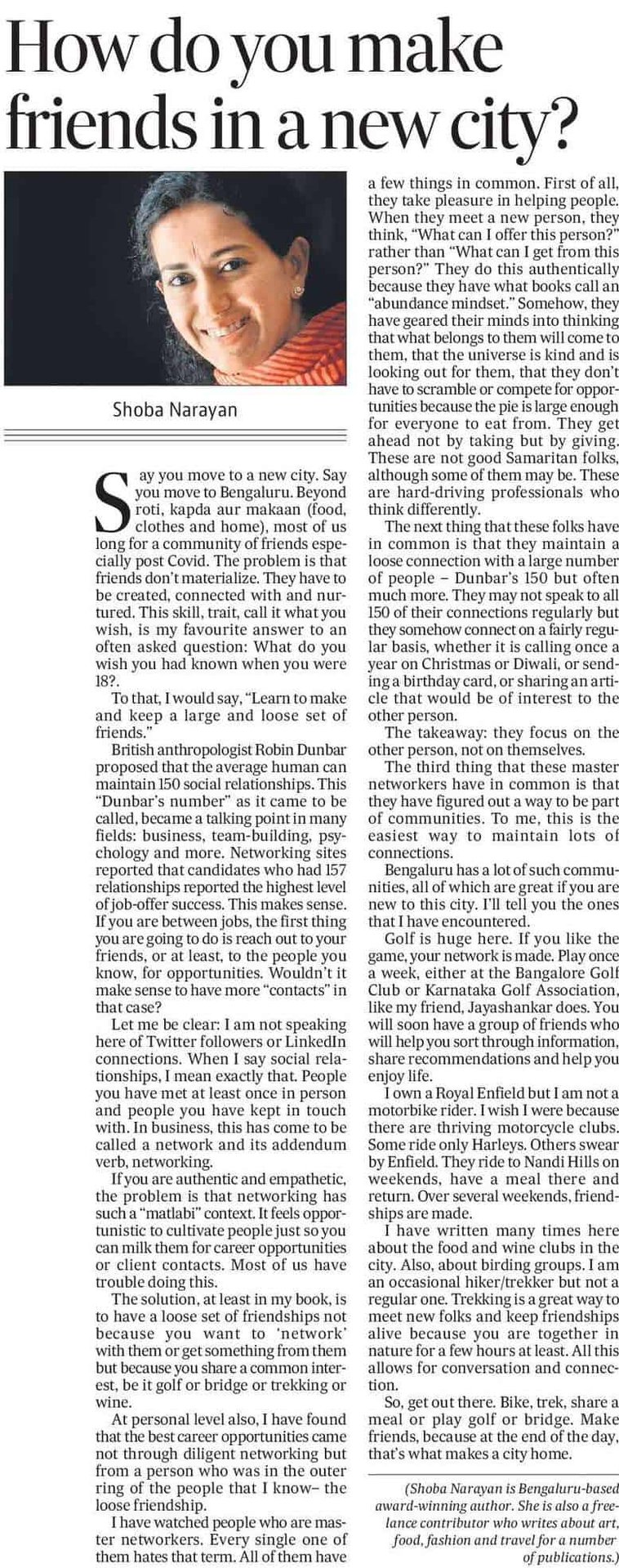Say you move to a new city. Say you move to Bangalore. Beyond roti, kapda aur makhan (food, clothes and home), most of us long for a community of friends especially post Covid. The problem is that friends don’t materialize. They have to be created, connected with and nurtured.