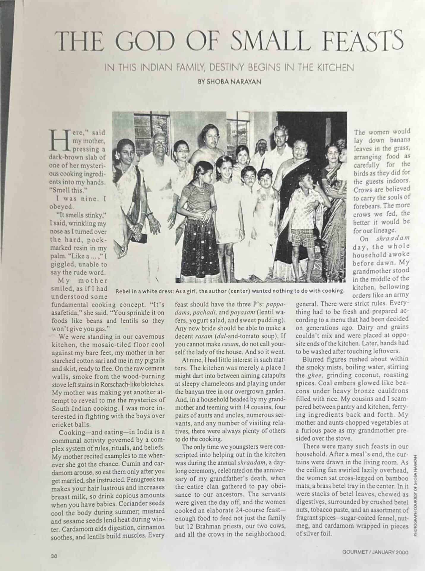 The only time we youngsters were conscripted into helping out in the kitchen was during the annual shraadam, a daylong ceremony, celebrated on the anniversary of my grandfather’s death, when the entire clan gathered to pay obeisance to our ancestors. The servants were given the day off, and the women cooked an elaborate 24-course feast—enough food to feed not just the family but 12 Brahman priests, our two cows, and all the crows in the neighborhood. The women would lay down banana leaves in the grass, arranging food as carefully for the birds as they did for the guests indoors. Crows are believed to carry the souls of forebears. The more crows we fed, the better it would be for our lineage.