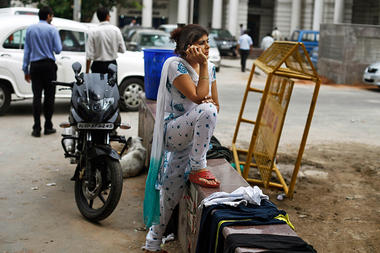 A commuter talks on a mobile phone in New Delhi, July 17, 2013. In bustling New Delhi, technology firms are pairing with the government’s village health program to work with rural women.