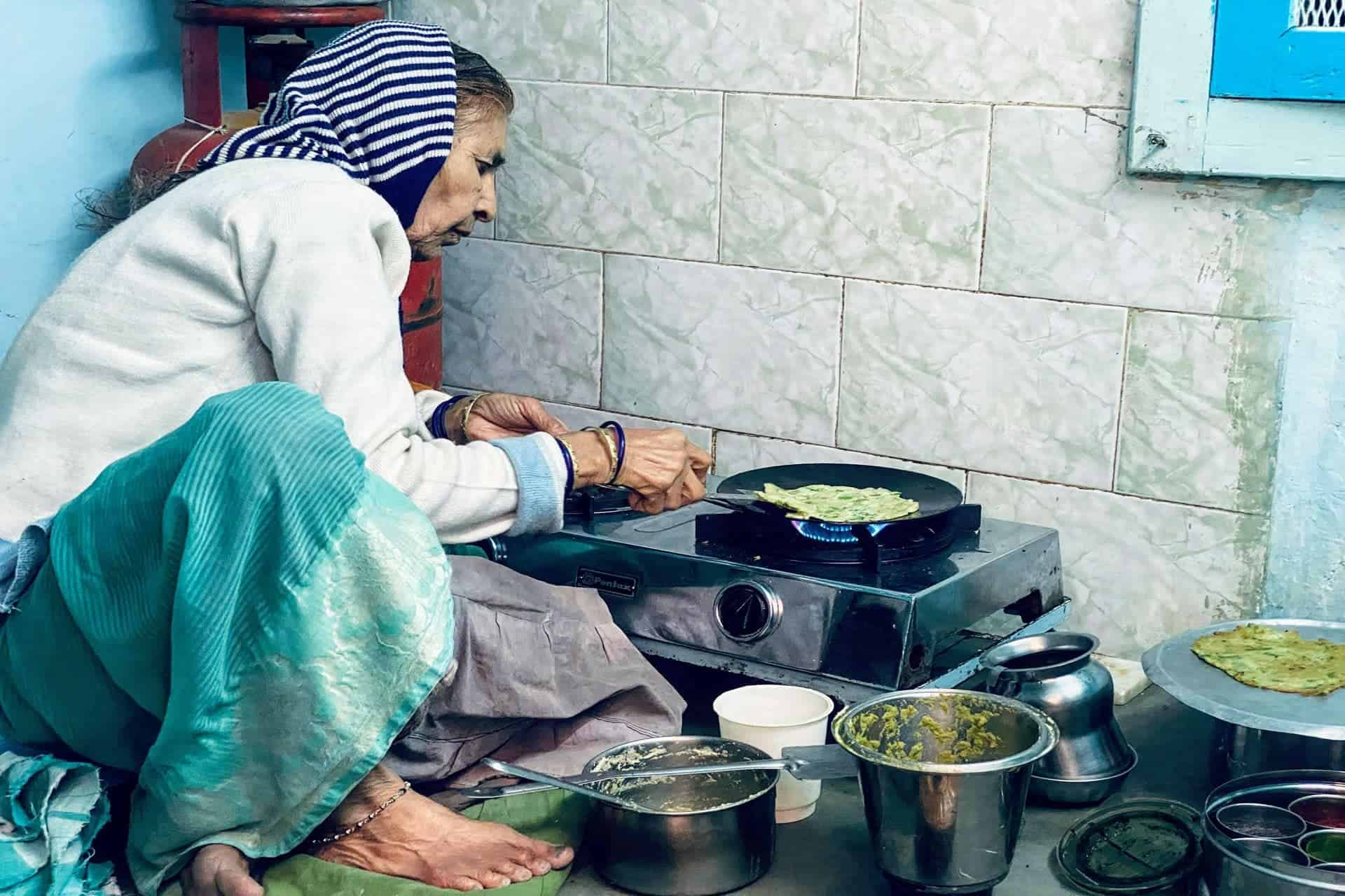 the lady looks up, smiles through her spectacles
