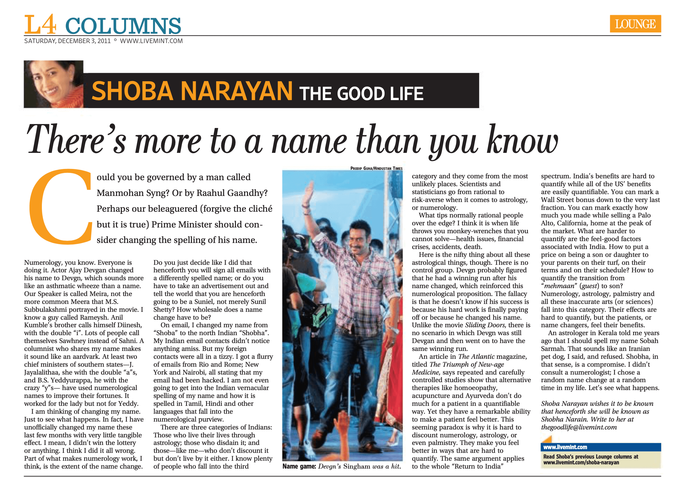 Here is the nifty thing about all these astrological things though. There is no control group. Devgn probably figured that he had a winning run after his name changed, which reinforced this numerological proposition. The fallacy is that he doesn’t know if his success is because his hard work is finally paying off or because he changed his name. Unlike the movie, Sliding Doors, there is no scenario in which Devgn was still Devgan and then went on to have the same winning run.