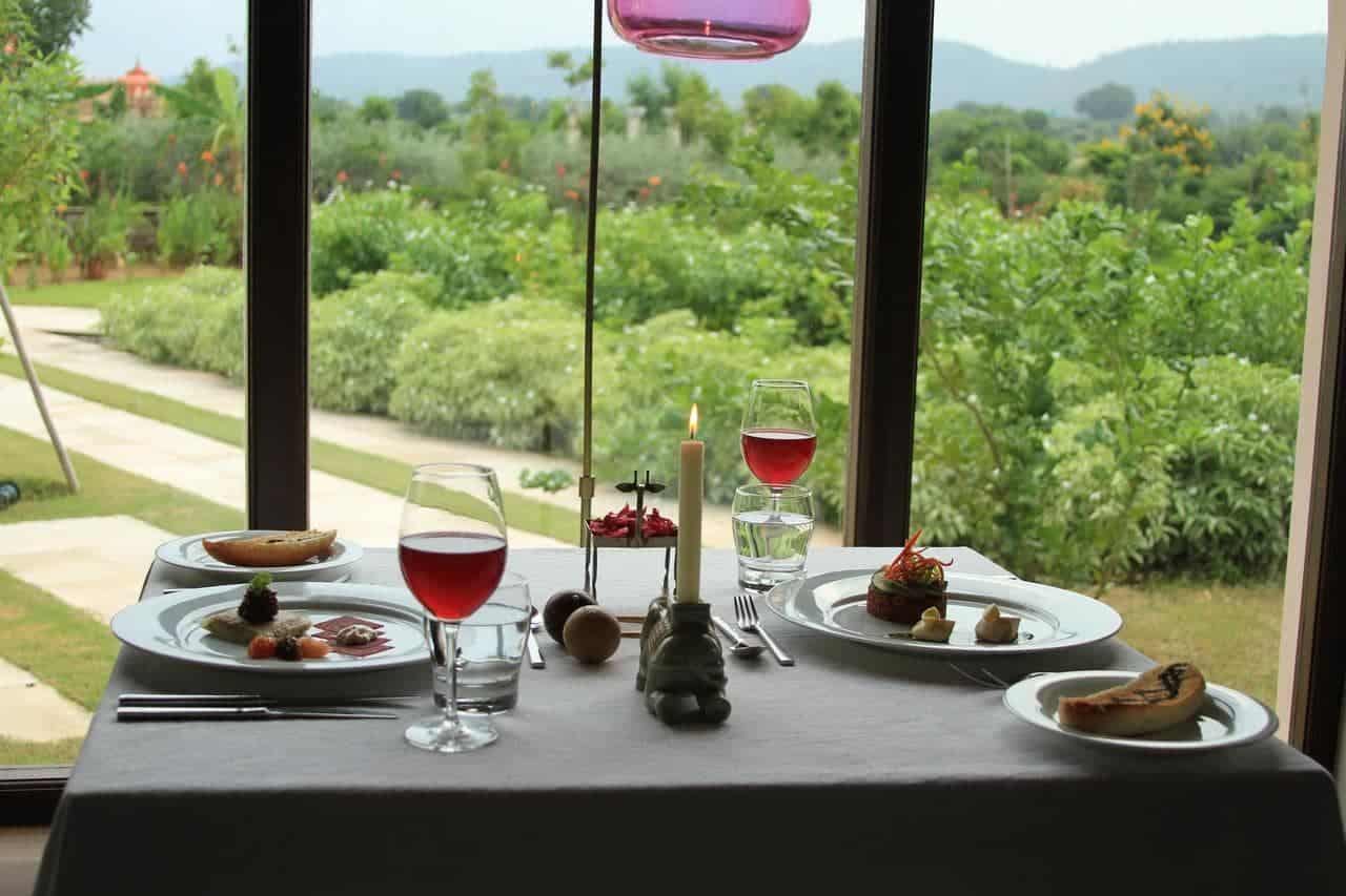 Saphire restaurant, with a mix of white marble and aquamarine upholstry, is open all day. Breakfast is continental—eggs, croissants and excellent capuccinos made from a European machine lie alongside Indian flatbreads, fruits and nuts. The rooftop fine-dining Indian restaurant, Rasa, does Rajasthani dishes in a thali or round plate which contains multiple dishes. Folk dancers balacing pots on their head swirl around to live music. The bar downstairs with a billiards table has high-quality liquor.