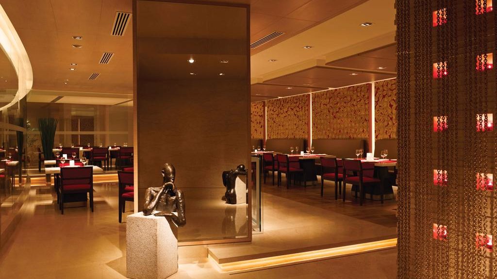 Contemporary, modern and minimalist with Indian touches. The hotel has multi-floor hanging glass sculptures reminiscent of Dale Chihuly at the entrance; metal sculptures by Bangalore-based artist Dimpy Menon adorn the corners. Minimalist white marble, geometric lines and splashes of red from the abstract paintings give the hotel an attractive functional character. There are spots of sumptuousness: the Indian restaurant, Maya, has an entire wall with hand-painted gold leaf layered over a red finish.