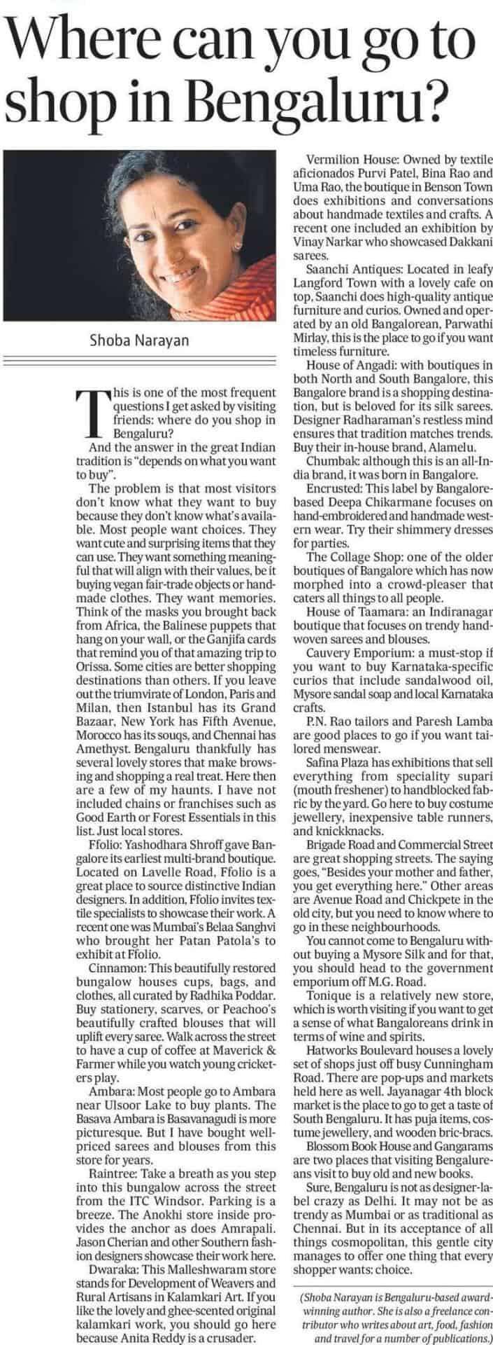 Vermilion House: Owned by textile aficionados Purvi Patel, Bina Rao and Uma Rao, the boutique in Benson Town does exhibitions and conversations about handmade textiles and crafts.  A recent one included an exhibition by Vinay Narkar who showcased Dakkani sarees.