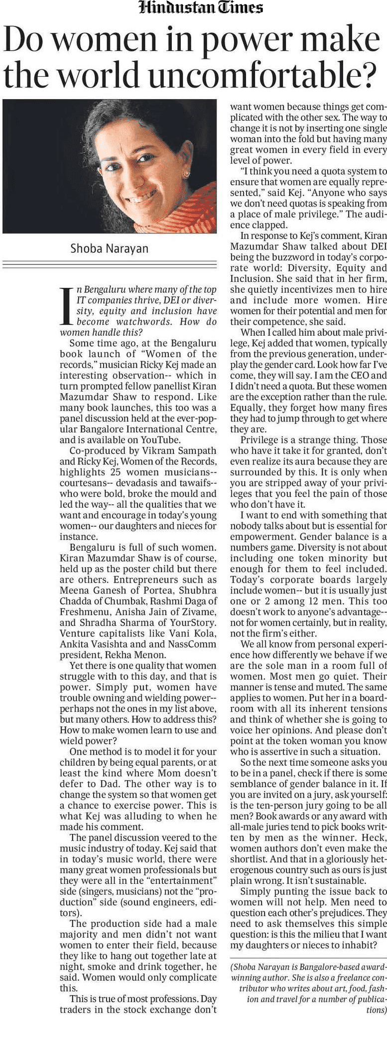 Some time ago, at the Bangalore book launch of “Women of the records,” musician Ricky Kej made an interesting observation– which in turn prompted fellow panelist Kiran Mazumdar Shaw to respond. Like many book launches, this too was a panel discussion held at the ever-popular Bangalore International Centre, and is available on Youtube.